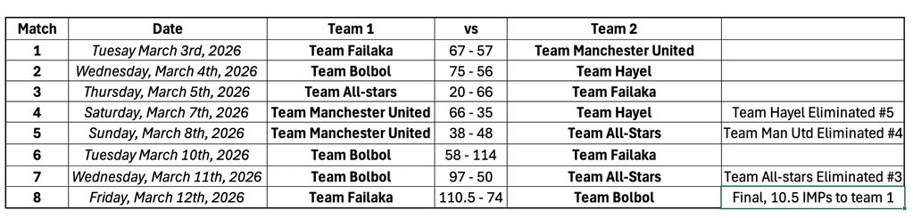 The unbeaten team will start with 10.5 IMP cushion. The other team automatically wins the toss. The final will be a 32 board match divided into 4 8-board stanzas.